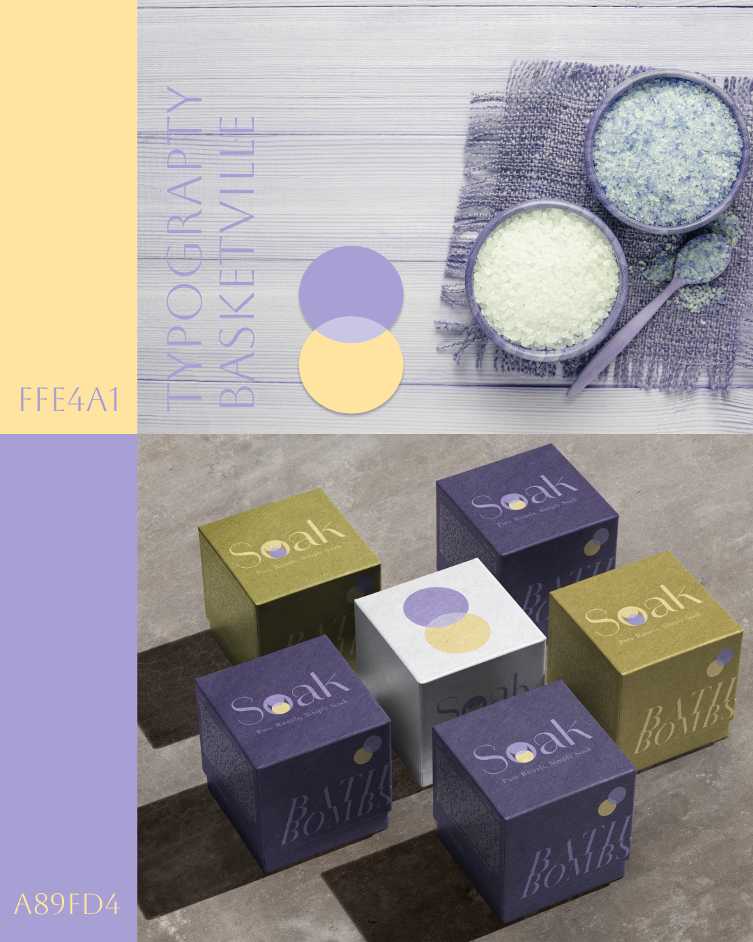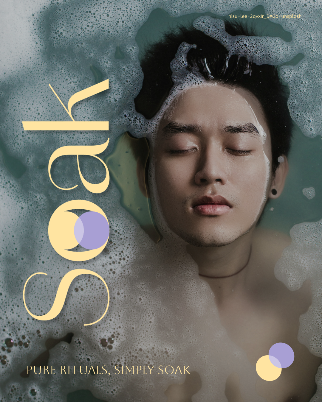Soak is a bath and self-care brand rooted in simplicity, serenity, and sensory elegance. Designed to evoke calm and clarity, the brand identity blends minimal design with natural warmth. The color palette—lemon curd yellow and soft pastel purple—offers a gentle contrast that feels both fresh and soothing, reflecting the balance between ritual and indulgence.